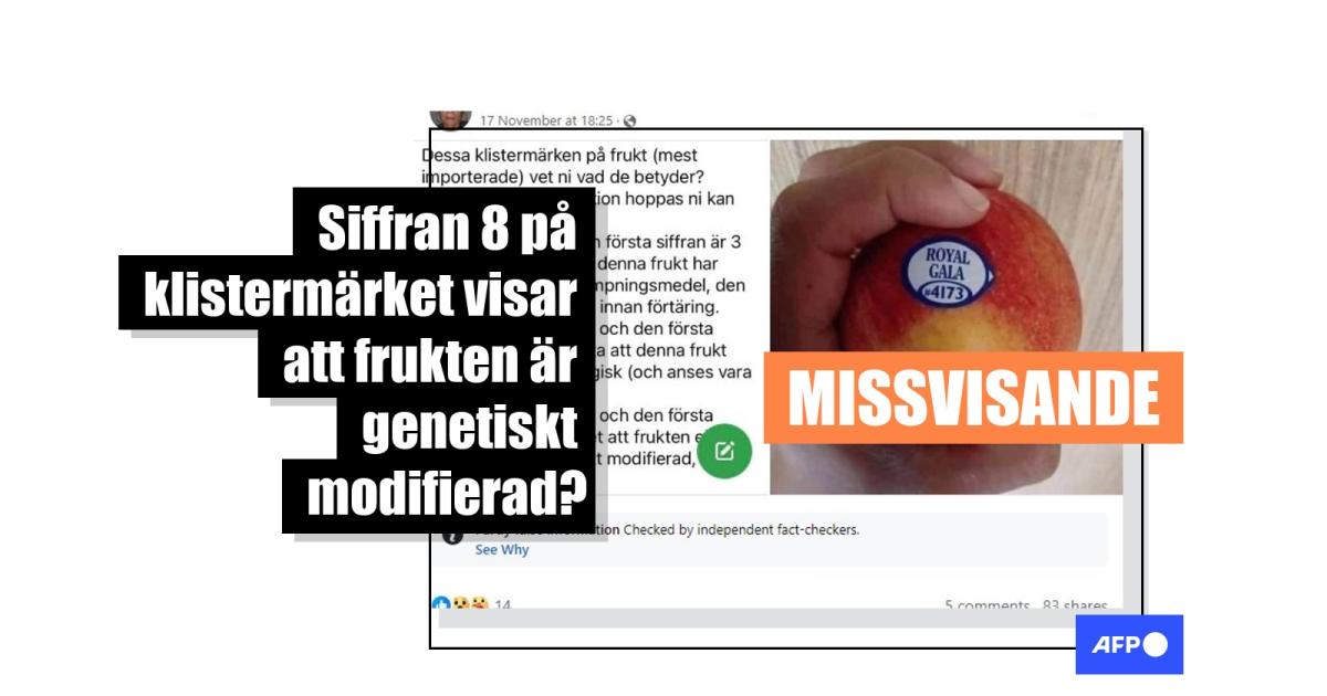 "Om antalet siffror är 5 och den första siffran är 8 betyder det att frukten eller grönsaken är genetiskt modifierad, det farligaste", påstås det i inlägget. Dessutom står det att om "det är 4 siffror och första siffran är 3 eller 4 betyder det att denna frukt har besprutats med bekämpningsmedel" och att "om antalet siffror är 5 och den första siffran 9 indikerar detta att denna frukt eller grönsak är ekologisk". Bredvid texten är ett foto av ett äpple som har ett klistermärke med numret "4173".