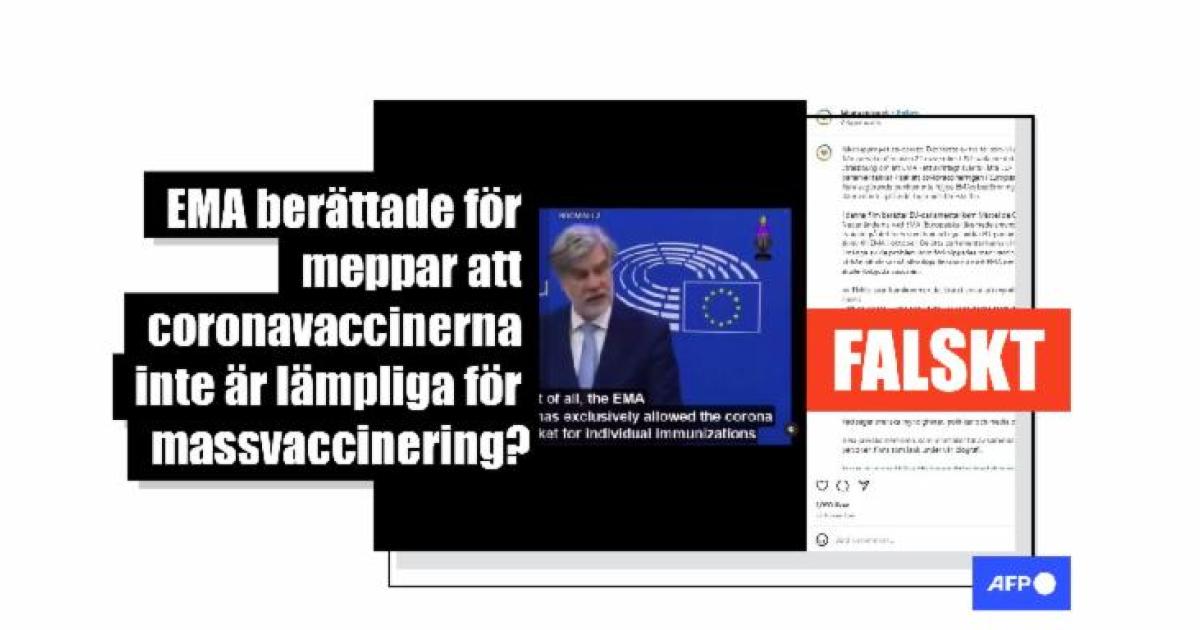 Europeiska läkemedelsmyndigheten (EMA), EU-myndigheten som övervakar läkemedel, godkände vacciner mot covid-19 i slutet av 2020. Vid en presskonferens i Strasbourg i november 2023 gjorde en ledamot gällande att EMA medgav i ett brev till meppar att vaccinerna inte var lämpliga för massvaccinering. Detta delades hundratals gånger i sociala medier på olika språk. Påståendet är falskt. EMA godkände vaccinet för att endast skydda de vaccinerade individerna men detta betyder inte att vaccinerna inte kunde användas för massvaccinering. Dessutom vet man i dag mer om vaccinernas effektivitet för att förebygga smittspridning än när de först kom på marknaden 2020.
