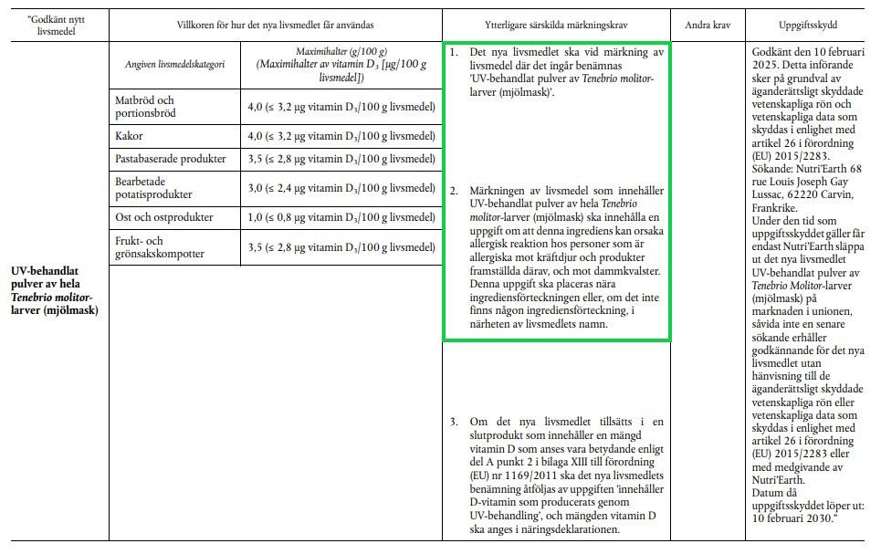 EU godkände "UV-behandlat pulver av hela Tenebrio molitorlarver (mjölmask)" som ett nytt livsmedel från och med den 10 februari 2025 i en förordning från den 20 januari 2025 (arkiverad version). Det står i förordningen att pulvret måste skrivas ut tydligt på produkter som innehåller det. Livsmedelsverket och en tjänsteperson vid Europeiska kommissionen berättade för AFP att E-nummer används för ämnen som har en teknisk funktion, såsom färgämnen eller konserveringsmedel.