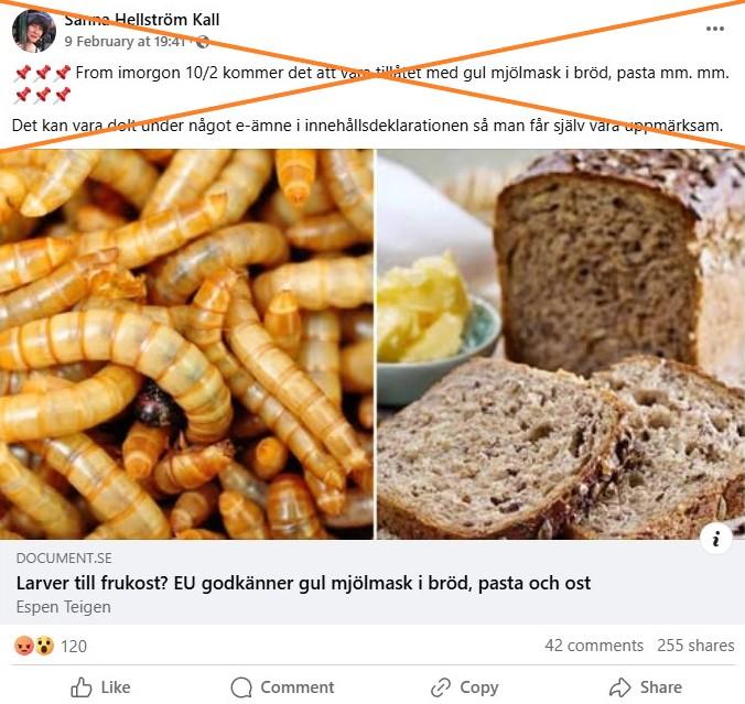 "Från och med imorgon 10/2 kommer det att vara tillåtet med gul mjölmask i bröd, pasta mm. Det kan vara dolt under något e-ämne i innehållsdeklarationen så man får själv vara uppmärksam", påstås det i ett svenskt Facebook-inlägg som publicerades den 9 februari 2025 och delats över 200 gånger sedan dess.