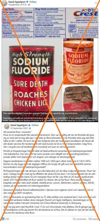 "Det är såklart en myt att det skulle vara bra för tänderna med fluor", påstås det i ett svenskt Facebook-inlägg som delats över en tusen gånger sedan det publicerades den 22 september 2022. I inlägget hävdas att fluorid är en restprodukt från aluminiumindustrin och att halterna i tandkrämer motsvarar de som finns i bekämpningsmedel.