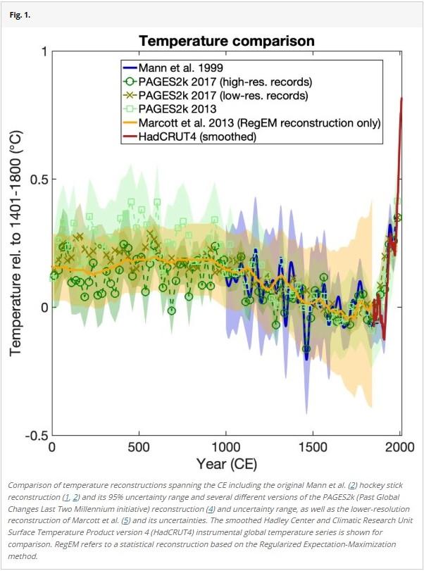 En graf i en artikel som publicerades av Mann i tidskriften Proceedings of the National Academy of Sciences 2021 (arkiverad version) visar hur temperaturrekonstruktioner av olika källor kommit fram till samma trend som den ursprungliga hockeyklubbskurvan: