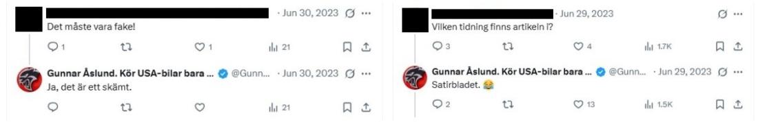 Fejkartikeln bär kontonamnet "@GunnarAslund".