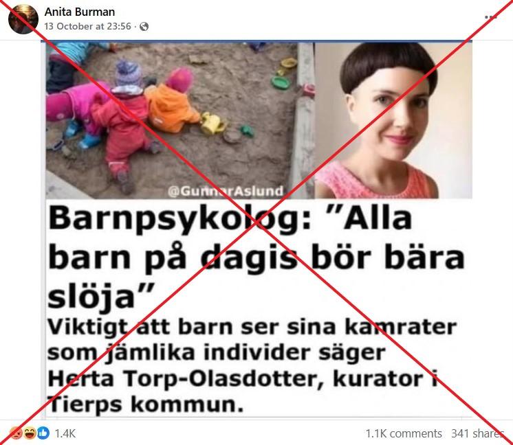 "Barnpsykolog: 'Alla barn på dagis bör bära slöja'", står det i rubriken till vad som ser ut som en nyhetsartikel som delades i ett Facebook-inlägg. I ingressen står det vidare: "Viktigt att barn ser sina kamrater som jämlika individer säger Herta Torp-Olasdotter, kurator i Tierps kommun."