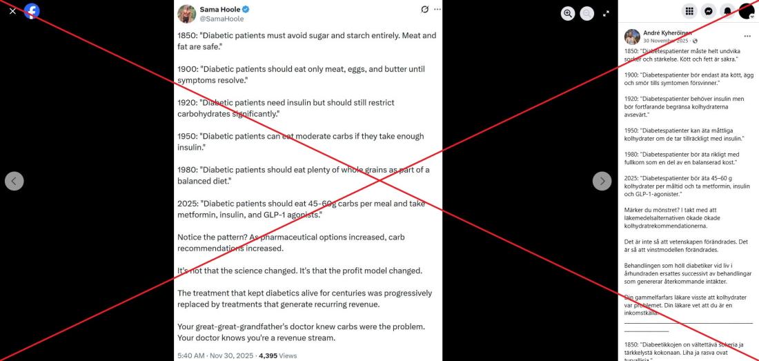 I ett Facebook-inlägg skrivet på både svenska och finska tittar man på hur kostrekommendationerna för diabetes har förändrats mellan 1850-talet och idag. Inlägget börjar med en situation där diabetespatienter var tvungna att "helt undvika socker och stärkelse" och "kött och fett" var "säkra". Efter detta ökar den rekommenderade mängden kolhydrater tillsammans med läkemedel och år 2025 bör personer med diabetes "äta 45–60 g kolhydrater per måltid och ta metformin, insulin och GLP-1-agonister". Slutsatsen i inlägget är påståendet att "behandlingen som höll diabetiker vid liv i århundraden ersattes successivt av behandlingar som genererar återkommande intäkter. Din gammelfarfars läkare visste att kolhydrater var problemet. Din läkare vet att du är en inkomstkälla".