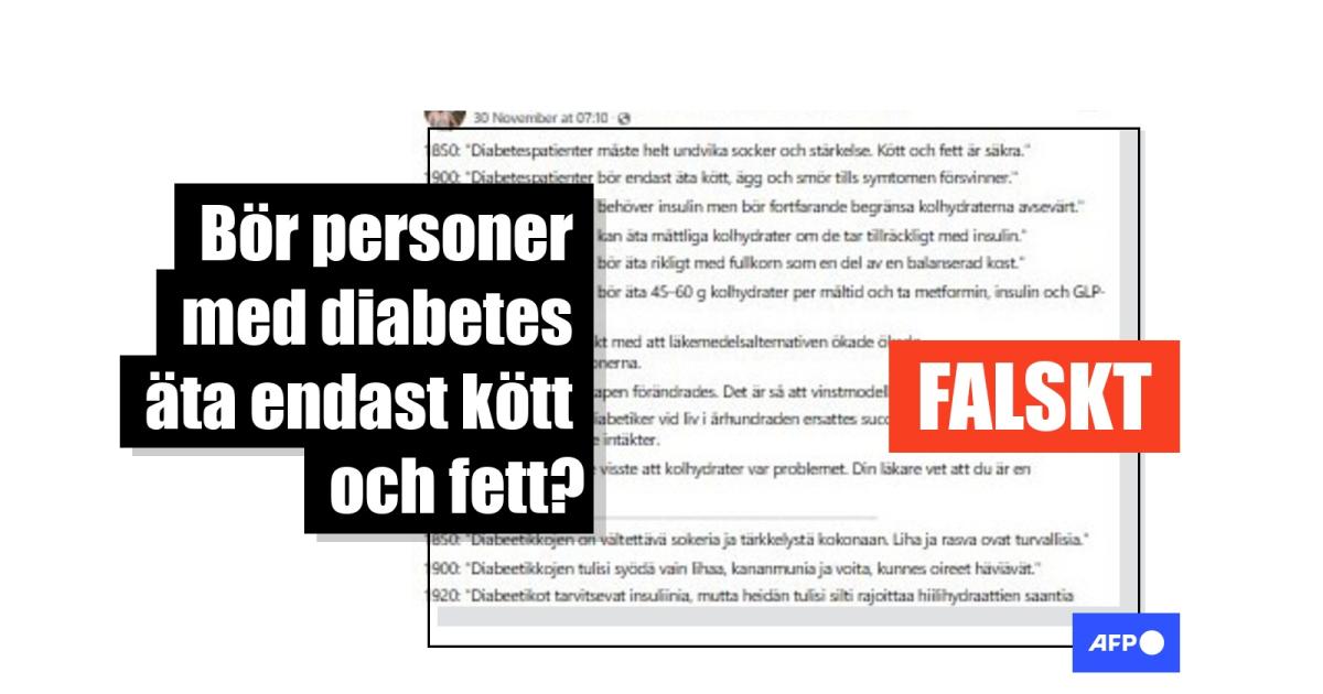Diabetes är en grupp sjukdomar som kan behandlas med läkemedel och välbalanserad kost. I inlägg som spridits i sociala medier hävdas ändå att läkemedel endast används för att generera vinster och att det bästa sättet att behandla sjukdomen är att följa kostråd från 1850-talet. Enligt råden ska man undvika alla kolhydrater och äta kött och fett istället. Påståendena spreds på olika språk i slutet av 2025. Experter berättade för AFP att kolhydrater är en viktig del av en hälsosam kost även för personer med diabetes. Innan insulin upptäcktes på 1920-talet ledde typ 1 diabetes snabbt till död och en extremt begränsad kost, som ofta ledde till svår hunger, kunde endast förlänga livstiden med några månader eller år.