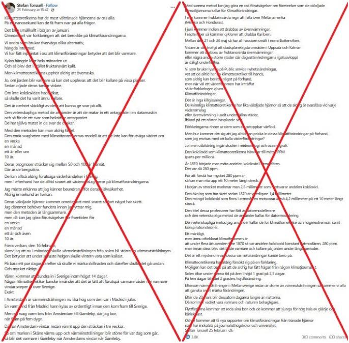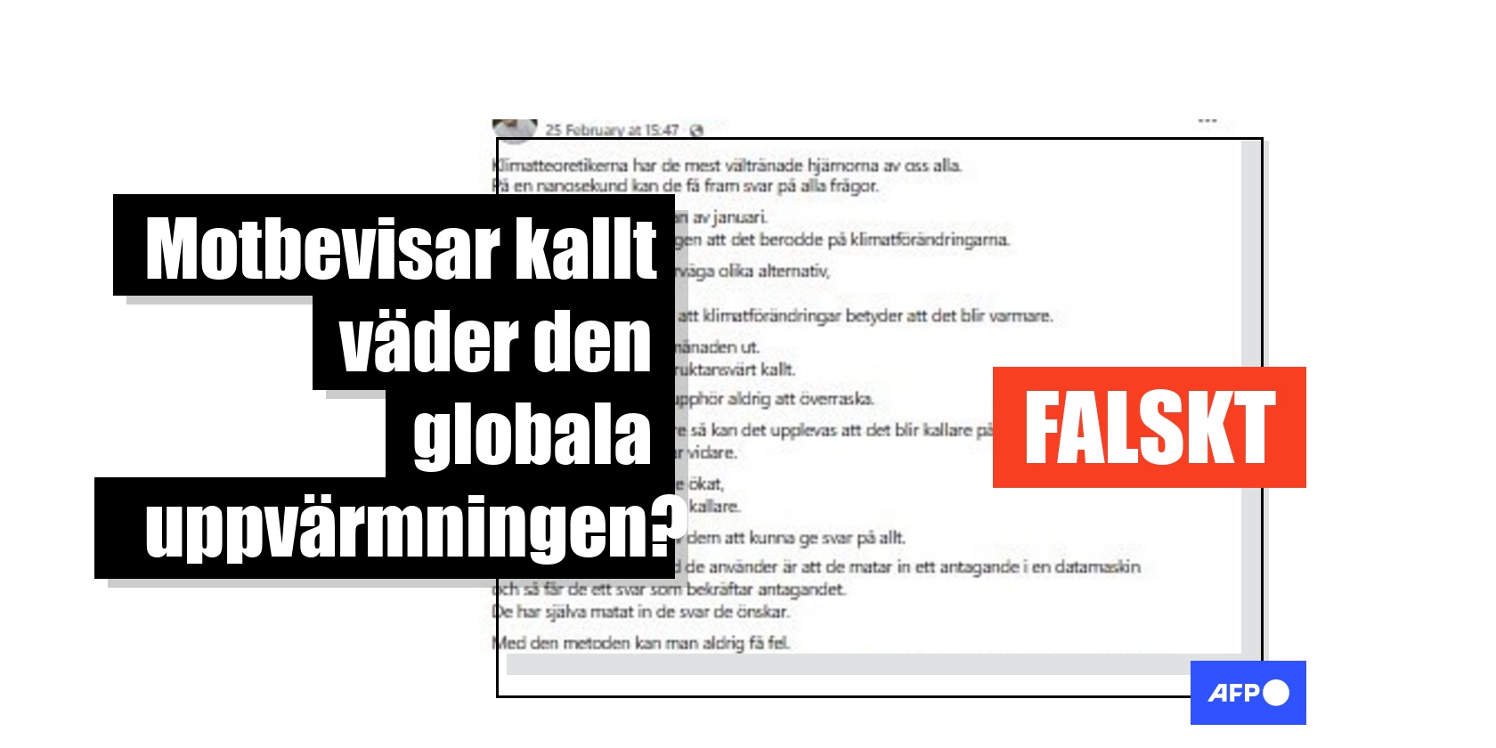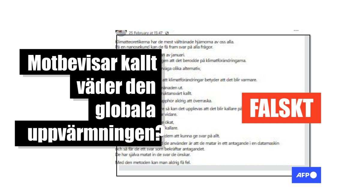 I Sverige uppmättes kallare temperaturer än vanligt i januari 2026. Detta ledde till en spridning av välkänd desinformation där de nuvarande mänskligt orsakade klimatförändringarna förnekas. Ett inlägg på Facebook från slutet av februari 2026 som spreds viralt ifrågasätter klimatforskningens trovärdighet och hävdar att klimatmodeller är utformade så att de endast bekräftar forskarnas antaganden och att det saknas forskning om variationerna i klimatet före 1870-talet. I inlägget antyds även att mängden koldioxid i atmosfären är så pass liten att den inte kan ha en betydande effekt. En överväldigande majoritet av forskare är överens om att koldioxidutsläpp driver den nuvarande uppvärmningen av jorden. Klimatmodellerna är inte perfekta men de kan testas genom att jämföra dem med reella observationer, sade experter till AFP.