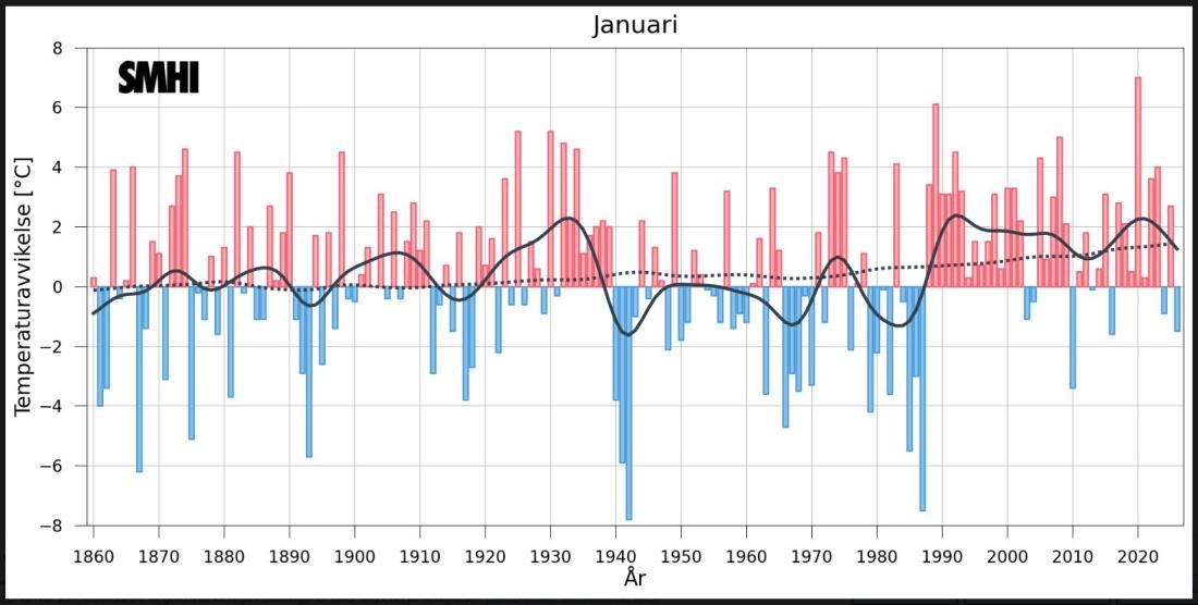Grafen nedan från SMHI visar hur temperaturer i januari har blivit varmare mellan 1860 och 2020-talet: