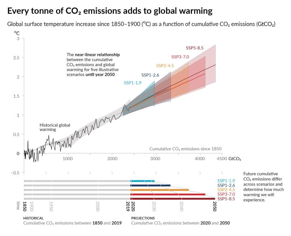 Grafen nedan från IPCC:s rapport visar att det finns ett nästan linjärt samband med koldioxidutsläpp och stigande temperaturer, d.v.s. att jordens uppvärmning beror på hur mycket koldioxid som släpps ut i atmosfären: