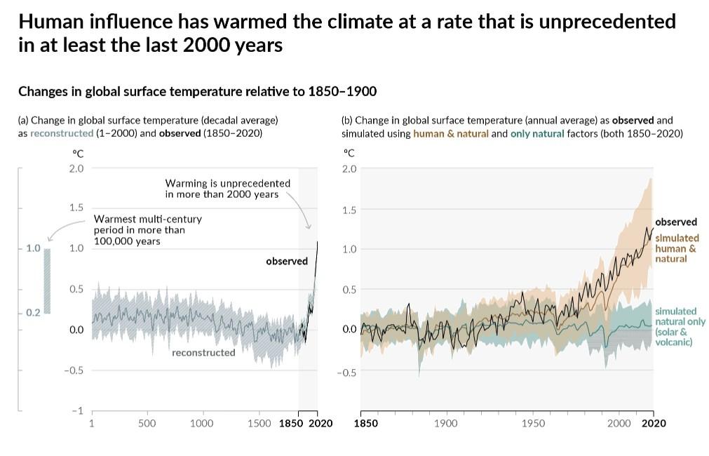 Enligt FN:s mellanstatliga klimatpanels (IPCC) sjätte utvärderingsrapport har mänsklig verksamhet bidragit till uppvärmningen av klimatet med över en grad sedan slutet av 1800-talet (arkiverad version). Rapporten (arkiverad version) publicerades mellan augusti 2021 och april 2022 och är den mest omfattande utvärderingen av vetenskap som berör klimatförändringarna.